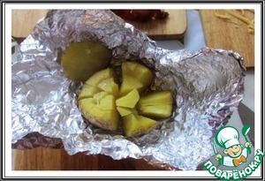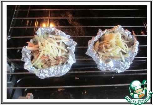 Снимаем "крышечку", кладем её рядом с картофелиной, посыпаем картошину половиной натертого сыра, обжимаем фольгу в виде корзинки и ставим в духовку ещё на 5-7 минут