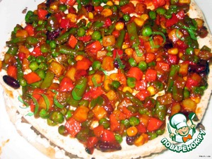 Накрываем листиком питы, выкладываем овощную начинку с кетчупом (красным соусом).