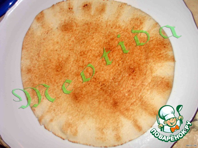 На сервировочное блюдо кладем один листик питы, хорошо смазываем 1/3 белого соуса.