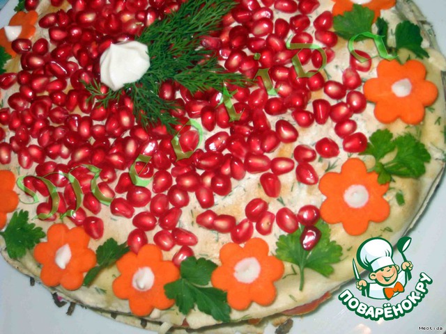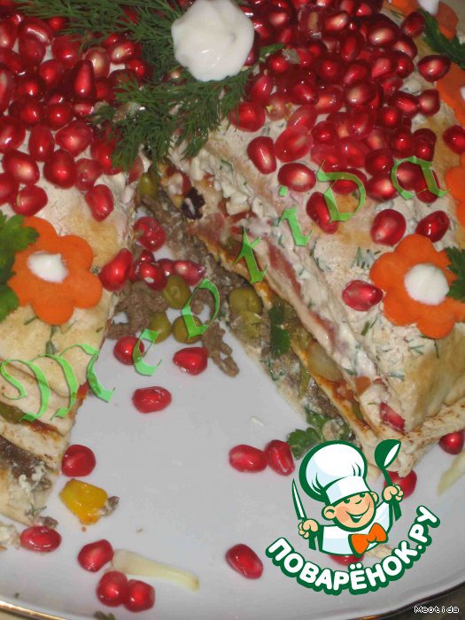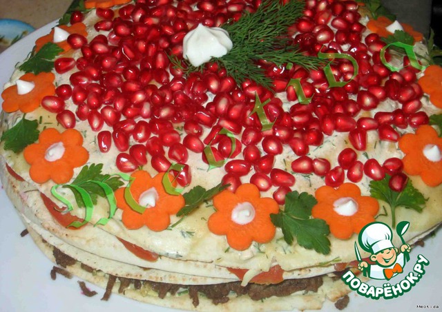 Яркий... вкусный... нежный... с интересными начинками... БЕЗ МАЙОНЕЗА... Быстро... просто... вкусно... сытно... красиво... В качестве пышек будем использовать лепешки (пита), можно испечь самим, а можно и готовыми воспользоваться... Немного говяжьего фаршика с лучком и ароматными специями... Чуть-чуть тушеных овощей с карри и кетчупом (или красным соусом)... Помидорчик - для свежести в сочетании с колбасным сыром... Все это со сметанно-горчичным соусом... с укропчиком и чесночком... И в довершение всего - ягодки граната... для салюта :) :) :) Этот тортик хорош и в горячем, и в холодном виде... Он может быть и самостоятельным ужином, и украшением праздничного стола...