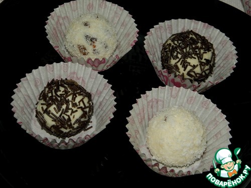 Обвалять готовые пирожные в кокосовой стружке, в измельчённых орешках или тёртом шоколаде.