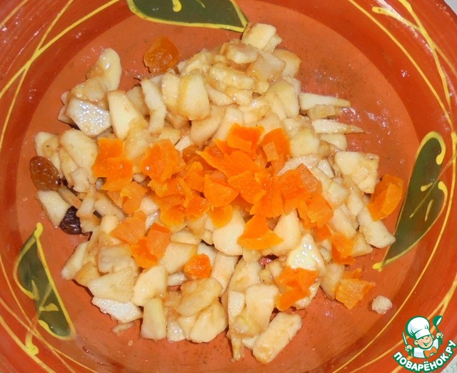 Режем мелко курагу и добавляем в начинку. Перемешиваем.