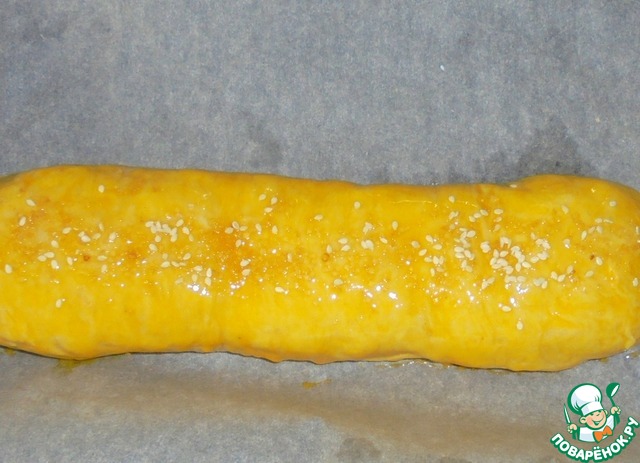 Сворачиваем в рулет и защипываем края. Кладем на противень.