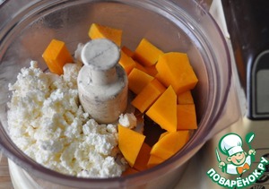 Берём кухонный комбайн или блендер и измельчаем нарезанную тыкву и творог в однородную массу.