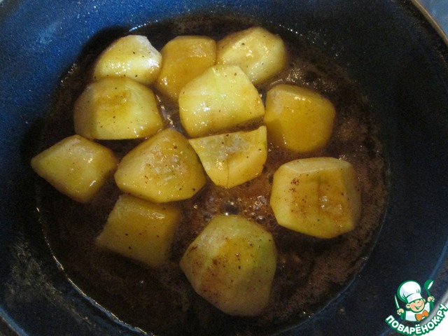 Яблоки очистите, разрежьте на четвертинки, удалите сердцевину. В сковороде растопите сливочное масло с медом. Выложите яблоки, посыпьте корицей и мускатным орехом. томите на небольшом огне, иногда помешивая, до мягкости яблок, примерно минут 5. Яблоки не должны развалиться!