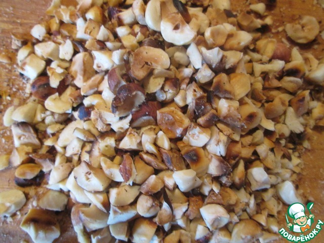 На сухой сковороде обжарьте фундук. Обжаренные орехи положите в полотенце, заверните и потрите, чтобы избавиться от шелухи. Порубите не слишком мелко.