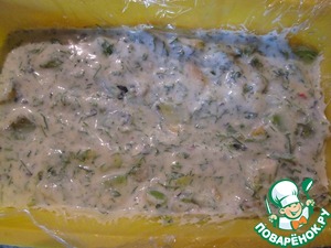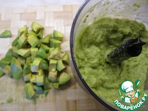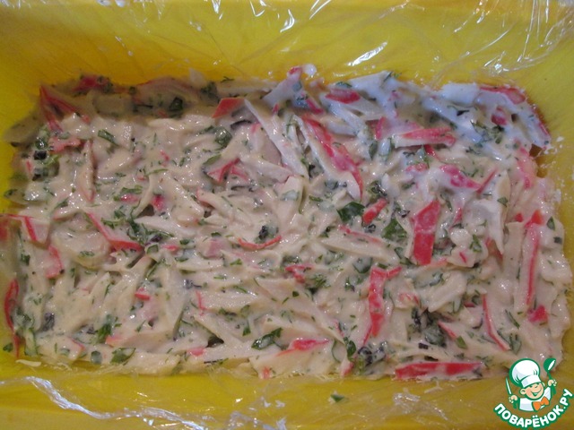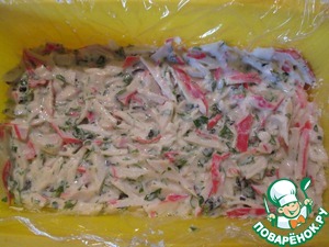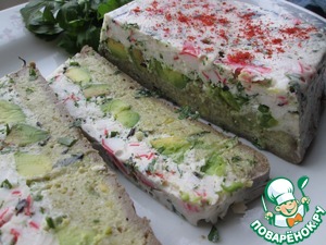 Получившуюся смесь разделите на три части. В первую добавьте крабовое мясо и половину зелени. Во вторую добавьте оставшуюся зелень и авокадо, порезанное кубиками. В третью - пюре из авокадо. Теперь собираем террин. На дно формы выкладываем смесь с крабовым мясом.