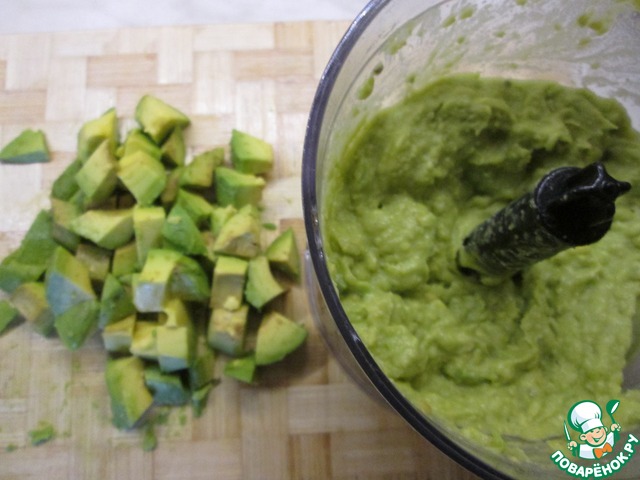И последним слоем будет смесь рикотты и пюре из авокадо.