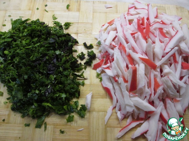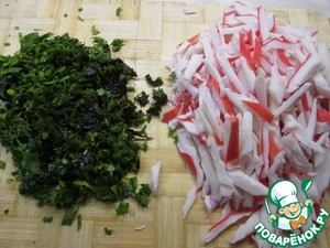 Крабовое мясо нарезаем соломкой, мелко рубим зелень.
