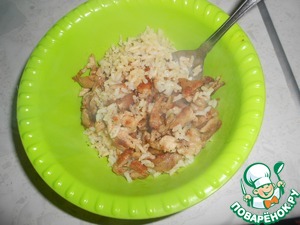 Рис вынуть из пакетика, добавить курицу. Добавить огурец, нарезанный соломкой.