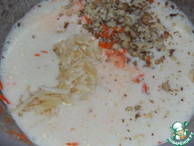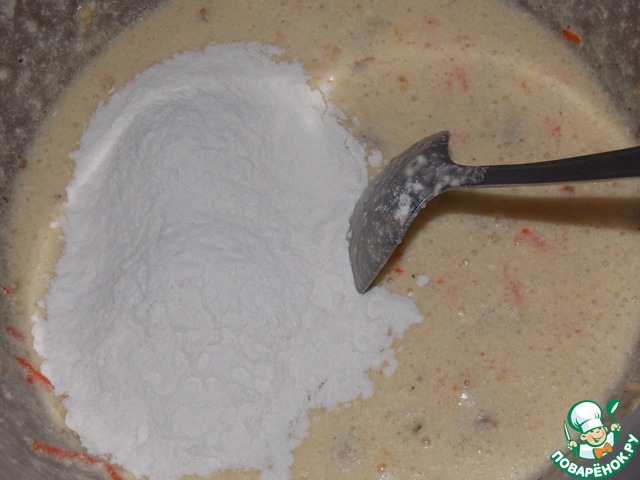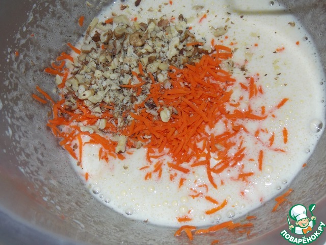 Добавить морковь и орехи в тесто.