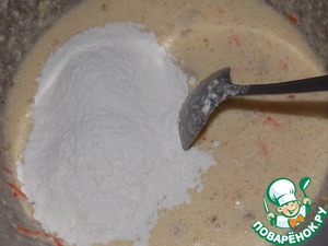 Всыпать разрыхлитель и муку. Перемешать до однородности.