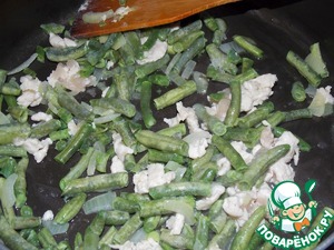 Добавить фасоль. Жарить 5 минут. Влить немного воды (3-4ст. л.), накрыть крышкой и тушить на медленном огне 5-7 минут.