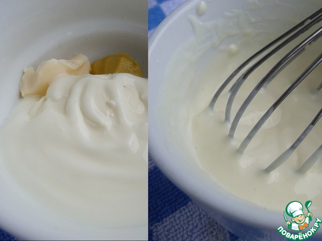 В чашечке смешать горчицу, майонез, сливочный сыр, йогурт.