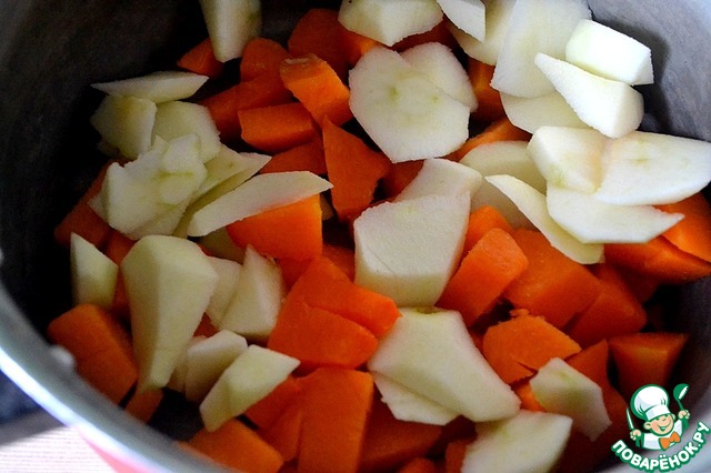 В тыкву кубиками режу очищенные яблоки, добавляю воду и провариваю все до мягкости.
