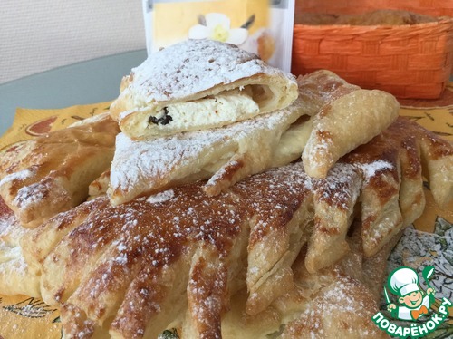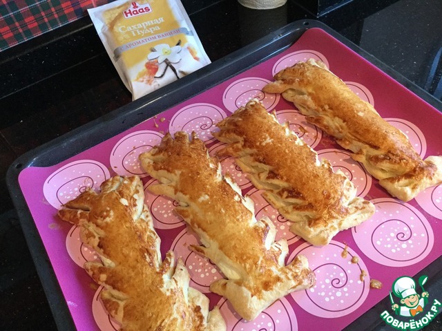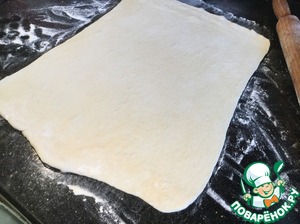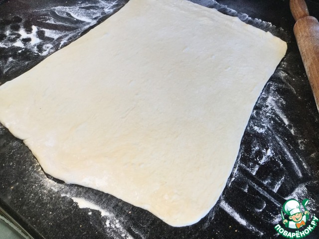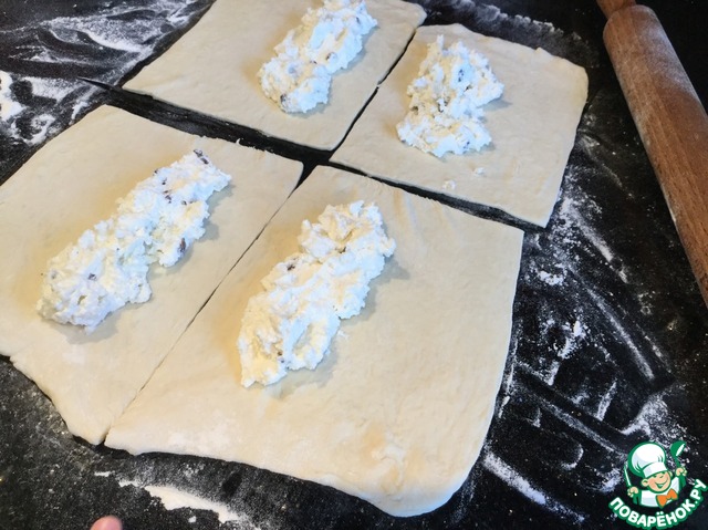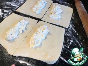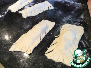 Тесто немного раскатайте, нарежьте на прямоугольники.