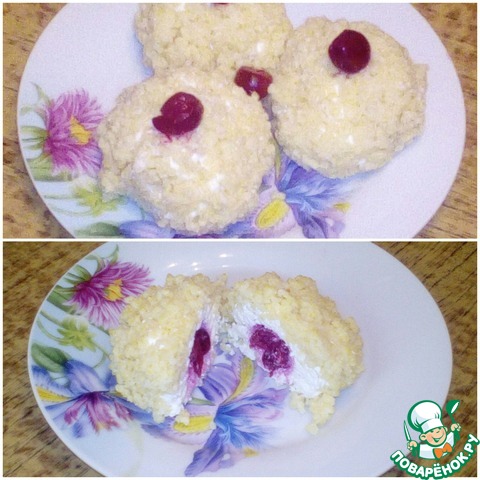 Расплющить творог и вложить в середину вишенку (которые отцедили ) - я вкладывала по 2-3 ягодки. -