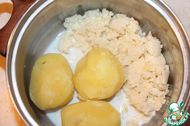 Картофель отварить, добавить туда 1/2 пакета готового пшена, натертый сыр, сливки, соль, мускатный орех, белок.