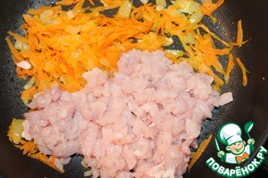 Лук с морковью обжарить, добавить мелко нарубленное куриное филе, тушить 5 минут.