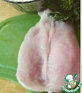 Куринное филе промыть, просушить, порезать продольно как на отбивные. Слегка отбить.