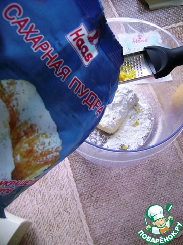 В чашу блендера выложить масло, желтки и добавить ванильный сахар и сахарную пудру. Я брала пудру от «Haas». Сюда же стереть цедру одного лимона, предварительно ошпарив его кипятком. Очень хочу еще раз сказать спасибо Вике – victoria ms – за чудесную терку для цедры. Очень удобно снимать цедру такой длинной терочкой – просто играючи.