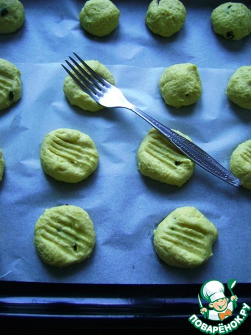 Аккуратно, сухими руками, скатывать из теста шарики размером с пинг-понговый шарик и укладывать на лист с пергаментом посвободнее. Затем печенья приплюснуть вилкой для придания более плоской и красивой формы.