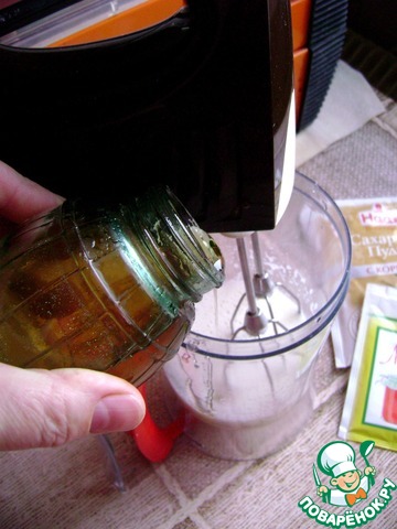 Взбить яйца с сахарной пудрой в пышную пену. Я взяла пудру с корицей от «Haas».
