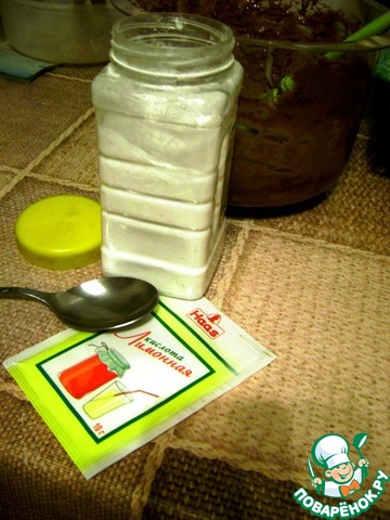 Развести чайную ложку лимонной кислоты (у меня от «Haas») в 2 столовых ложках воды и погасить этим раствором соду. Вылить содовую пенку в тесто и быстро размешать.