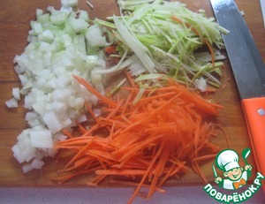 Репчатый лук нарезаем мелкими кубиками, морковь и кабачок натираем на терке для приготовления "Моркови по-корейски". -
