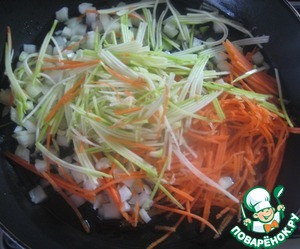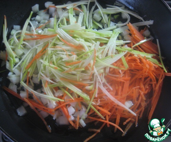 Разогреваем на сковороде растительное масло, отправляем обжариваться на среднем огне лук, морковь и кабачок.