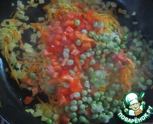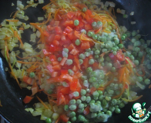 Добавляем зеленый горошек и нарезанный небольшими кубиками болгарский перец. Не забываем помешивать.