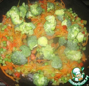 Брокколи разбираем на маленькие соцветия. Добавляем к овощам, перемешиваем, накрываем сковороду крышкой и тушим до готовности.
