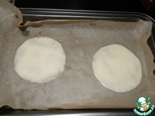 Переворачиваем пергамент рисунком вниз в форму и ложкой выкладываем чайной ложкой на кружок тесто, так чтобы оно не растеклось за пределы круга.