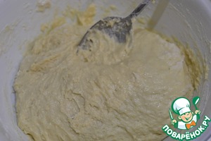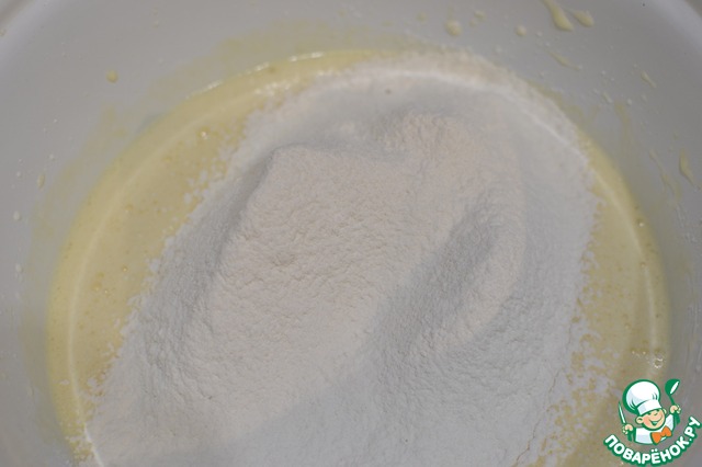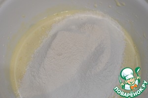 В сливочно-яичную смесь постепенно добавляем просеянную с разрыхлителем муку.
