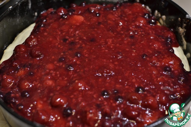 На сайте есть пирог с Rote Grütze уважаемой Ларисы Kleine Hase, но и тесто и способ приготовления совсем другой. Рецепт найден мной на немецкоязычном кулинарном сайте. При описании ингредиентов я рядом буду указывать количества из первоисточника. Форма у меня круглая диаметром 23 см, в оригинале 30*40, но мне кажется, тогда ягодной начинки можно больше.