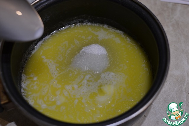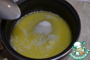 На водяной бане в кастрюльке растапливаем масло, добавляем сахар, молоко -