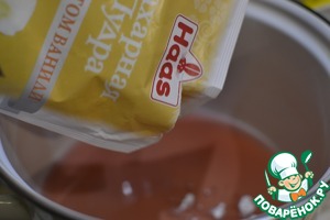 В оставшемся соке разводим сахар, сахарную пудру, кипятим, добавляем разведенный крахмал при постоянном помешивании- получается очень крутая масса.
