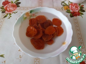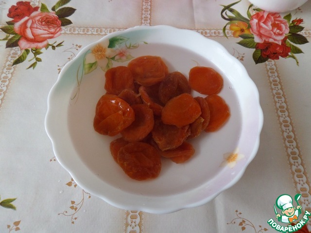 Курагу промываем водой. Кладем в чашку и заливаем горячей водой. Оставляем на 10 минут.