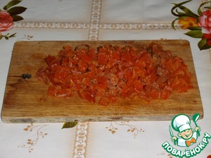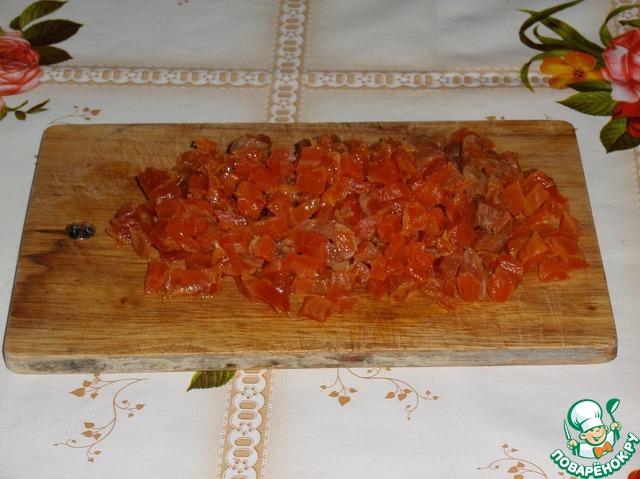 Курагу нарезаем мелим кубиком.