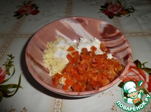 В чашку выкладываем отварное пшено, творог, нарезанную курагу и 1 ст. л. сахара.