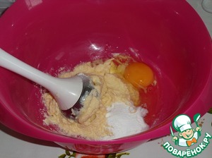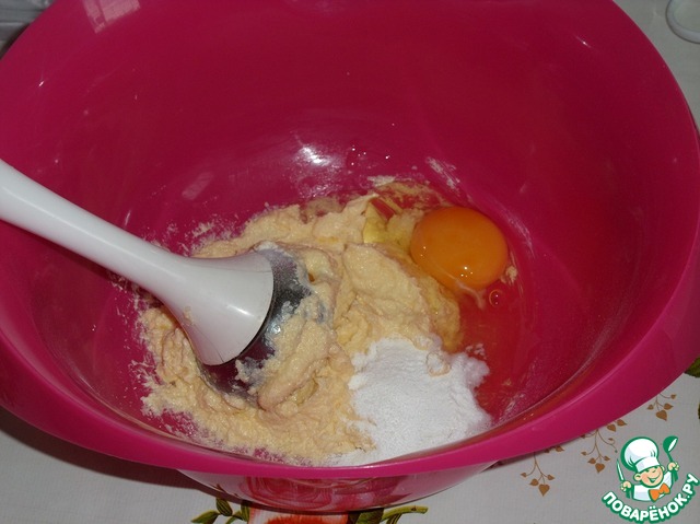 Добавляем 2 яйца, разрыхлитель теста, ванилин. Хорошо взбиваем.