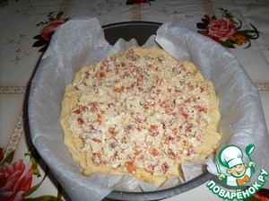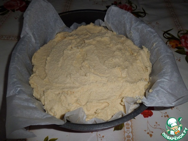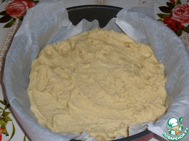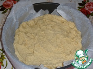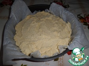 В форму, застеленную пергаментом, выкладываем половину теста. Равномерно распределяем.