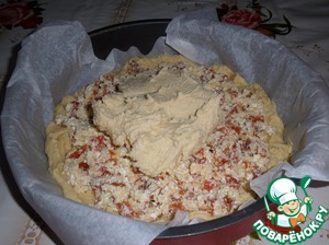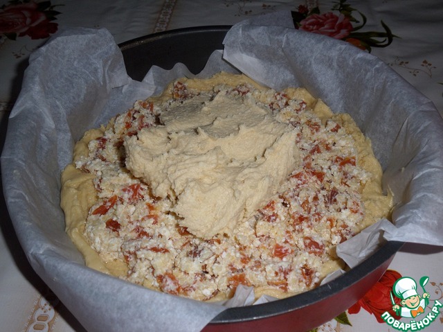 Поверх начинки выкладываем оставшееся тесто. Равномерно распределяем с помощью ложки.