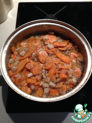 В эту же сковороду положить и слегка (до мягкости или полумягкости) обжарить лук с морковью, добавить сало.