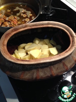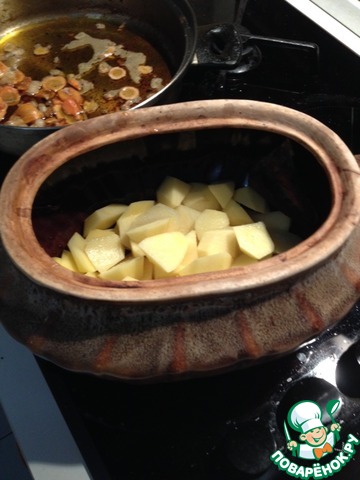 На дно горшочка выложить "смесь" моркови, лука, сала. Затем слой картофеля.