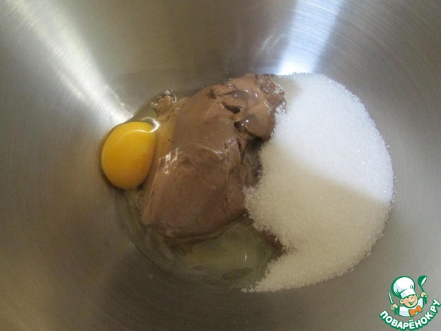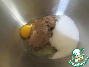 В чаше блендера смешать сахар, рикотту (у меня шоколадная) и яйцо до однородности. -
