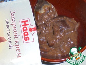В тарелку высыпаем смесь для приготовления шоколадного заварного крема. Разбавляем половиной молока.
