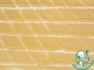 Раскатать тесто и вот здесь есть один секрет - если Вы хотите очень хрустящее печенье, то раскатывайте его тонко, а если больше похожее на обычный хворост, то толщиной около 1 см.