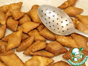 Масло влить в глубокую посуду, нагреть и обжарить тесто до готовности. Вынуть шумовкой и разложить на бумажном полотенце, чтобы стекло лишнее масло.
