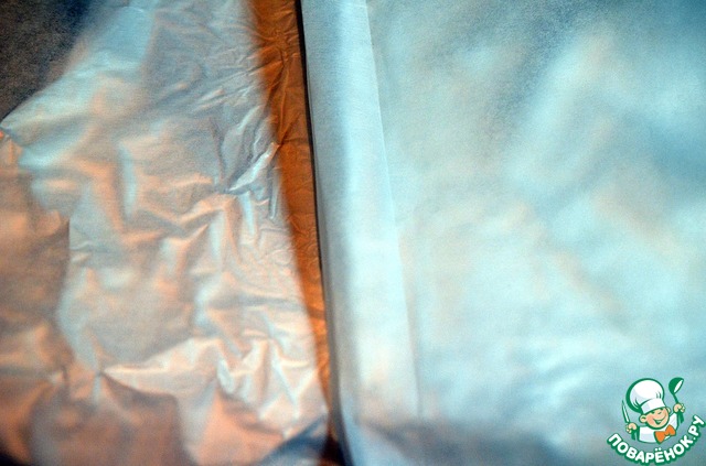 На рабочий стол постелить фольгу, сверху выложить кулинарную бумагу. По центру бумаги и фольги сформировать «складку» высотой примерно 2 см.
